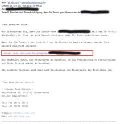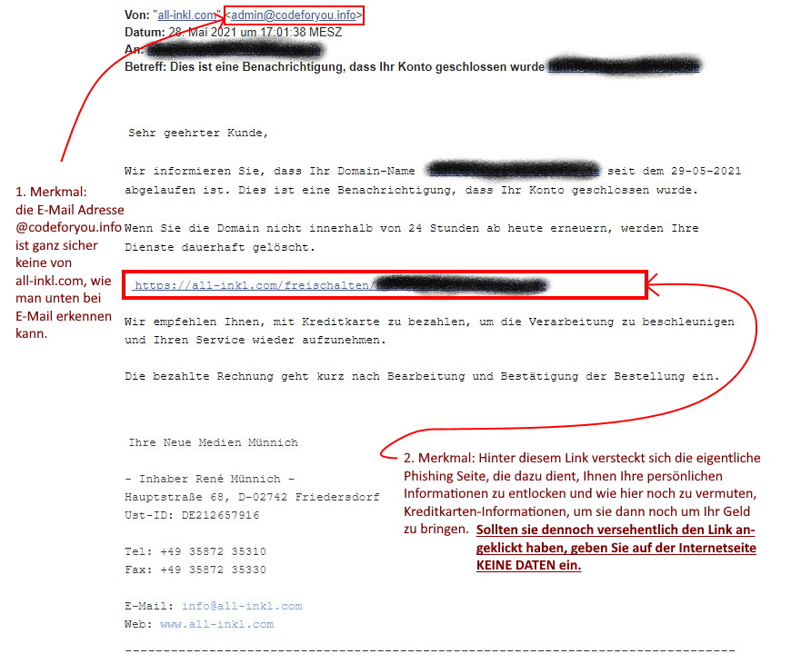 Im folgenden zeigen wir ein Beispiel wo ein Webseiten Provider hier All-Inkl.com einem Kunden schreibt, das seine Domain abgelaufen ist und wenn er diese nicht binnen 24h erneuert, seine Dienste dauerhauft gelöscht werden. Im nachstehenden Bild ist diese Mail abgebildet. Die betreffende Internetseite ist hier aufgrund des Beispiels unlesbar gemacht.