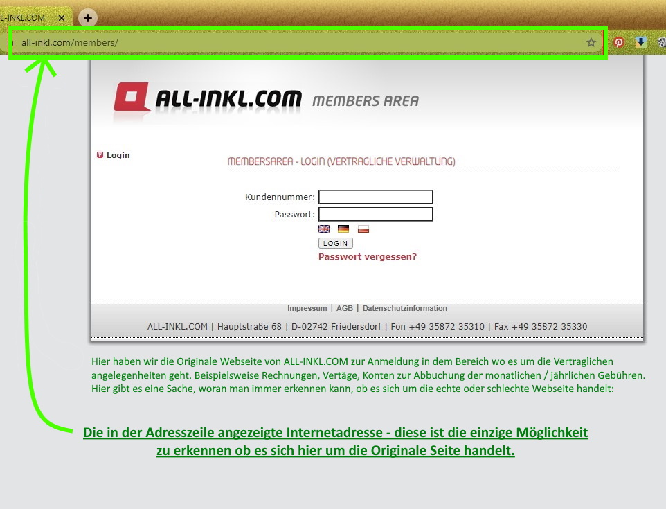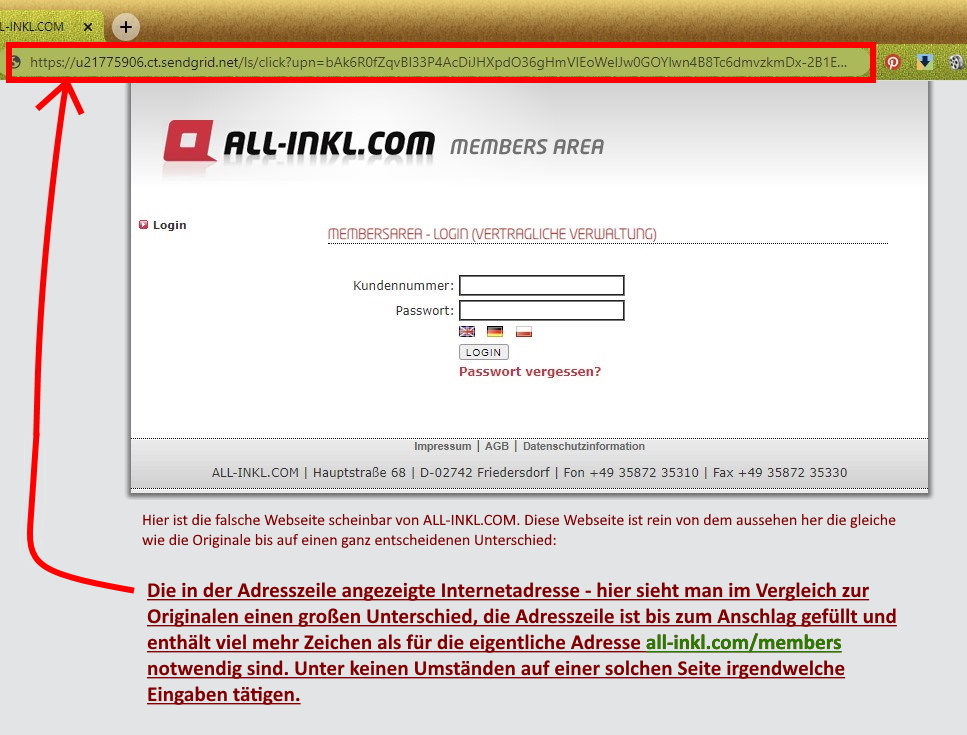 Nach der Mail, wollen wir noch auf die Webseite eingehen. Woran man erkennen kann, das es sich nicht um die Webseite des vermeidlichen Webserviceprovider handelt. Anhand der folgenden beiden Bilder zeigen wir eindeutige Merkmale einer falschen Webseite "Fake Webseite" oder auch "Phishing Webseite" im Vergleich zur originalen Webseite. Gute "Fake Webseiten" sind wirklich nahezu identisch mit denen der Originalen. Wie Sie gleich ebenfalls sehen werden. Beim betrachten beider Seiten wird auffallen, das sie sich wirklich zum verwechseln ähnlich sehen. Jedoch bei genauem hinsehen fällt einem die Internetseiten Adresse in der Adresszeile des Browsers auf (das ist die Zeile, wo man seine Suchanfragen einträgt, oder direkt Internetseiten aufruft). In diesem Falle sollte sie idealerweise all-inkl.com im Anfang stehen haben. Die Fake Seite hat hier anstelle der kurzen übersichtlichen und ausprechbaren Adresse eher eine kryptisch aussehende Adresse die alles andere als einfach auszusprechen ist. Im gegenteil manchmal ist die derat lang... ach das am Ende kommende Bild ist eine solche Adresse - schauen sie doch einfach selber.